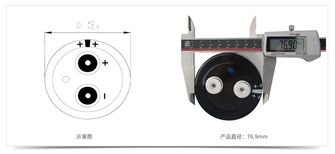 400V4700uF螺栓型電容器產(chǎn)品直徑為76.9mm。