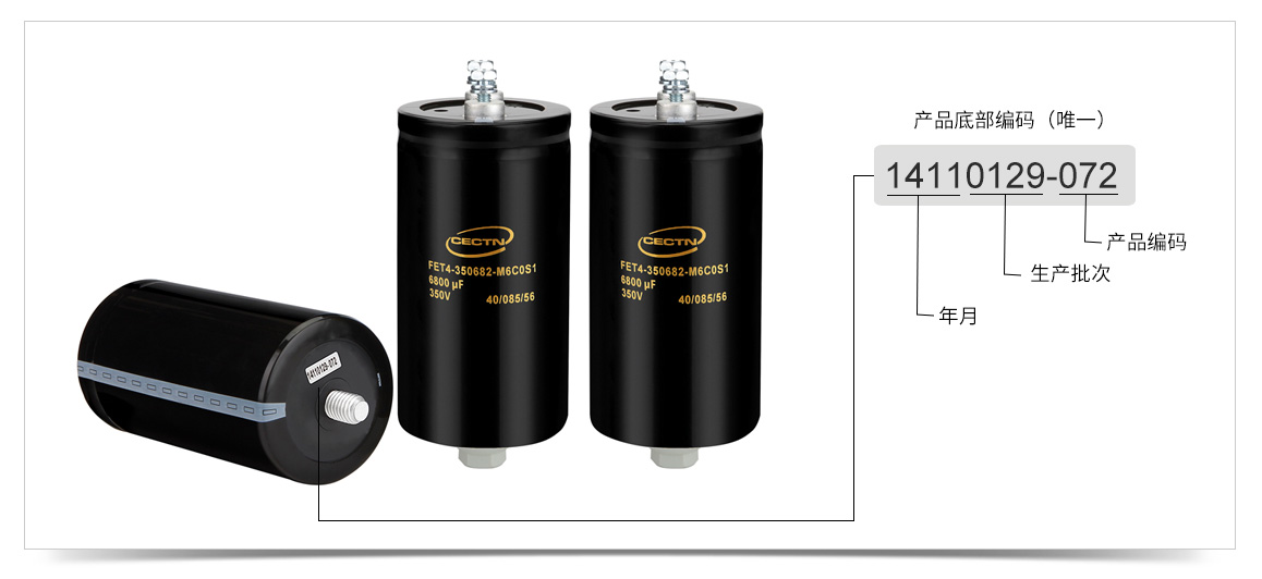 CECTN電解電容廠家所生產(chǎn)的么每一只螺栓型電解電容器都會賦予一個(gè)唯一的編碼,此編碼可用于追溯數(shù)據(jù),在螺栓型電解電容出廠后任可查詢該產(chǎn)品的所有生產(chǎn)記錄以及測試數(shù)據(jù)等信息。