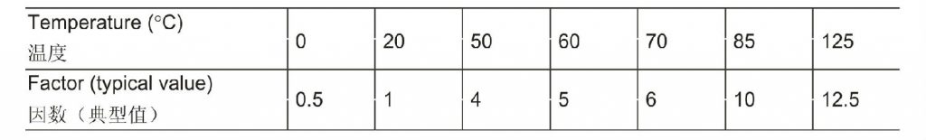 20℃溫度條件下取得的結果必須乘以以下因數,以取得通用和長壽命電容器工作漏電流的溫度特性。