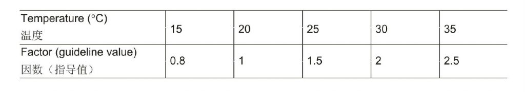 在15℃~35℃之間,均可實施漏電流的驗收試驗。然后,容許限值應乘以以下轉換因數,參考20℃時的值: