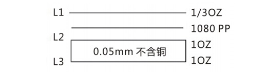 3.1.1 L2-3層采用用1OZ底銅芯板,如圖5,完成L2層線路后,選1/3 OZ銅箔進(jìn)行壓合,壓合后先將L1層的1/3 OZ減銅至6-8um,然后用干膜保護(hù)L1層,再將L3層由1OZ減銅至6-8um。