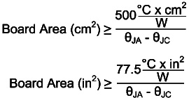 所需的PCB板面積近似值未考慮到散熱孔所發(fā)揮的作用,這些散熱孔將熱量從頂部金屬層(封裝連接至PCB)向底部金屬層傳遞。底層用作二表面層,對流可以從這里將板上的熱量傳送出去。為了使板面積近似值有效,需使用至少8~10個散熱孔。散熱孔的熱阻近似于下列方程式值。