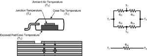 從半導(dǎo)體結(jié)到這些器件外封裝的熱阻抗(θJC)為1.9℃/W。雖然達到行業(yè)領(lǐng)先的θJC值就很理想,但當(dāng)外封裝到空氣的熱阻抗(θCA)太大時,低θJC值也毫無意義!如果沒有提供與周圍空氣相通的低阻抗散熱路徑,則熱量就會聚集在裸焊盤上無法消散。那么,究竟是什么決定了θCA值呢?從裸焊盤到空氣的熱阻完全受PCB設(shè)計以及相關(guān)的散熱片的控制。