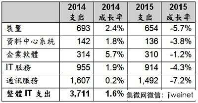 際研究暨顧問機構Gartner新預測顯示,2015年全球IT支出的規模為3.5兆美元,較2014年減少5.5%。分析師表示,IT支出下滑主要系美元升值所致,若以固定匯率(constant currency)計算則將成長2.5%。Gartner之前于4月份發表的預測,全球IT支出若以美元現價為準將下滑1.3%,若以固定匯率計算則成長3.1%。