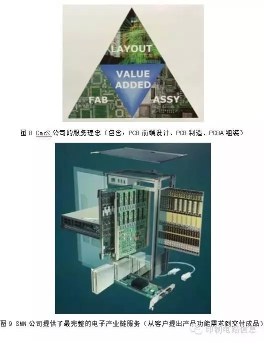 美PCB的核心競爭力之五在于其上、下游的整合能力以及向客戶提供一站式的服務(wù)能力,更突出其對于新產(chǎn)品研發(fā)的“快”之要求。大多數(shù)的美PCB工廠麻雀雖小、五臟俱全,有客戶的設(shè)計過程就已經(jīng)一起做了大量的溝通甚至參與或主導(dǎo)了設(shè)計工作之本身,故對于產(chǎn)品的特點了如指掌,生產(chǎn)起來自然也順利。一站式服務(wù)的內(nèi)容包括方案設(shè)計、信號完整性設(shè)計、PCB前端設(shè)計、PCB制造、PCBA組裝、裝配、測試等及相關(guān)工作。不同規(guī)模的公司,所提供服務(wù)的完整度和深度也各不相同,如圖8~圖10。 當然,這些公司在大批量生產(chǎn)階段是無法參與的,在后階段的PCB大批量生產(chǎn)則轉(zhuǎn)到了中。