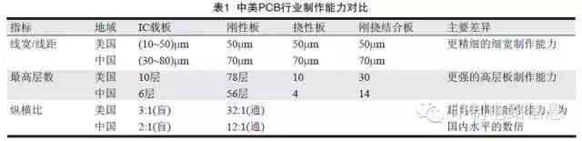 美PCB的核心競爭力之一在于其較強的制作能力,以表1從線寬線距、高層數(shù)、縱橫比等幾個指標解析兩內(nèi)PCB工廠的能力。