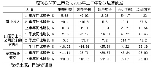 我覆銅板制造企業(yè)或包含有覆銅板制造的企業(yè),在深滬上市的共有5家公司。根據(jù)這些公司公布的業(yè)績報告,整理計算的各公司營業(yè)收入、歸屬于上市公司股東的凈利潤和基本每股收益3項指標(biāo)的增長情況,如下表。