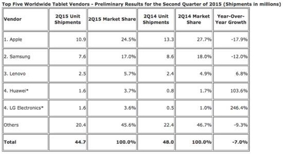 事實上不止蘋果,與一季度相比全球平板電腦出貨量繼續下滑4個百分點。IDC發布的二季度平板電腦銷量報告顯示,今年二季度全球平板電腦的出貨量為4470萬臺,較去年同期的4800萬臺縮減了7%。而包括屏幕較大的iPad和iPadMini在內,蘋果的平板電腦出貨量亦較早年同期下滑了26個百分點,至1090萬臺,市場份額為24.5%,仍舊位居一名。二名的三星出貨量為760萬臺,市場份額為17%。聯想位居三,出貨量為250萬臺,市場份額為5.7%。LG和華為并列四,出貨量均為160萬臺。