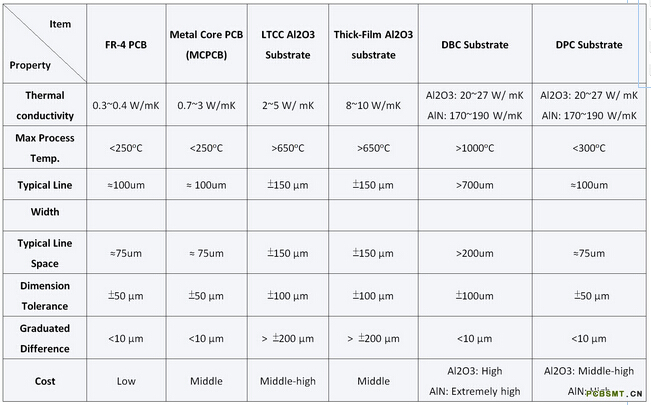 目前市場上廣泛使用的電路板類型如下表一所示,其中陶瓷基板其高導熱系數(shù)、高線路解析度、低累進公差、及允許打線工藝與直接共晶工藝等特性皆優(yōu)于FR-4 PCB與MCPCB。但是,陶瓷基板并非皆具有相同的特性,因工藝與材料的差異,陶瓷基板因而可分類為:低溫共燒陶瓷(LTCC, Low-Temperature Co-fire Ceramics)基板、厚膜(Thick-Film)陶瓷基板、DBC (Direct Bonding Copper)陶瓷基板與DPC (Direct Plating Copper)陶瓷基板,其中DPC陶瓷基板又可稱為薄膜(Thin-Film)陶瓷基板。
