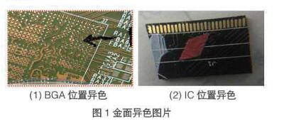 (1) 將沉金金缸金濃度提高至1.2g/L仍有異色現(xiàn)象,說(shuō)明金濃度不是導(dǎo)致IC或BGA異色的原因;