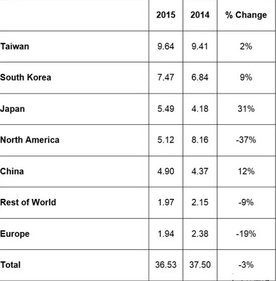 際半導體設備與材料協會-SEMI3月14日公布:2015年全球半導體制造設備總銷售為365.3億美元,較上一年減少了3%。2015年總設備訂單比2014年低5%。