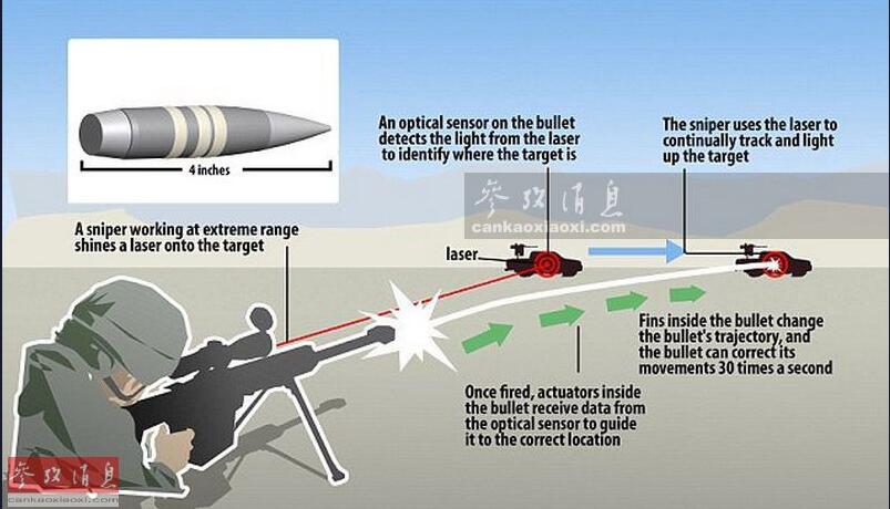 圖中直觀展示了激光制導子彈的交戰全過程,狙擊手在射擊前,只需持續性用激光照射標記目標即可,無需再保持傳統的”三點一線“瞄準方式,開槍后,制導子彈會和制導炸彈一樣,自動跟蹤目標直至命中,十分適合攻擊遠程移動目標。