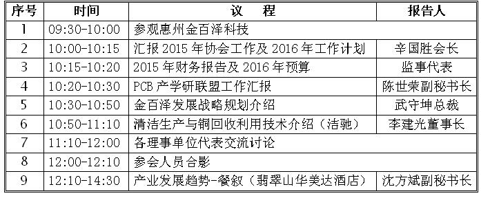 根據協會章程規定,為加強各理事單位之間的交流,推動協會工作的發展,現定于2016年5月6日上午在惠州市金百澤電路科技有限公司召開GPCA一屆四次理事會暨SPCA二屆五次理事會,參觀金百澤、匯報2015工作總結及2016年度工作計劃,現將會議內容及相關事項通知如下: