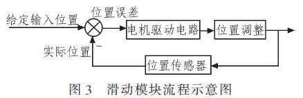 如圖3滑動模塊流程示意圖所示,本系統(tǒng)方案設(shè)計在傳輸系統(tǒng)和smt生產(chǎn)設(shè)備的連接處,增設(shè)一個滑動裝置,主要由滑動板、滾珠和位置傳感器組成,形成了一個閉環(huán)控制,起到平衡作用。在生產(chǎn)過程中,由模塊裝置上的位置傳感器實時將實際位置信號反饋給系統(tǒng),與給定輸入位置信號相比較產(chǎn)生一個位置誤差信號,然后由這個誤差信號驅(qū)動電機運轉(zhuǎn)進(jìn)行位置調(diào)整。當(dāng)設(shè)備平衡時,位置誤差為零,不進(jìn)行位置調(diào)整;當(dāng)傳輸機有偏斜時,位置誤差不為零,由它驅(qū)動電機運轉(zhuǎn),使設(shè)備進(jìn)行一定的位置調(diào)整。通過這套裝置,消除由振動產(chǎn)生位置偏移、利于整個生產(chǎn)線的生產(chǎn)、增強各設(shè)備之間銜接。