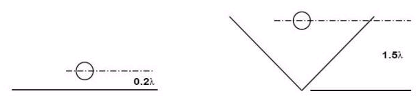 可將一個(gè)電流天線(例如:一個(gè)雙極天線)放在一個(gè)導(dǎo)電平面前,來產(chǎn)生一個(gè)定向天線。 當(dāng)間距為 0.1-0.3λ 時(shí),一個(gè) λ/2 雙極天線的增益大約是 6 dB(這是 6 dBd的意思,也就是 8 dBi ,因?yàn)橐粋€(gè)雙極天線的增益是 2 dBi)。