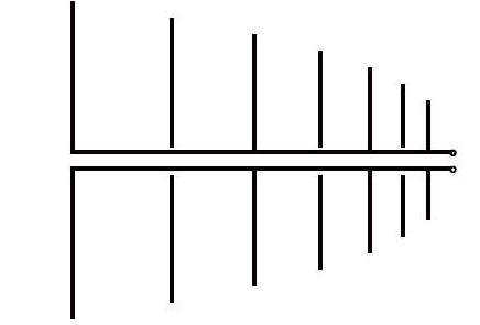 長(zhǎng)度漸增的雙極天線組可被普通的饋線饋給,產(chǎn)生一種數(shù)組天線,稱為「對(duì)數(shù)周期雙極數(shù)組(log periodic dipole array;LPDA)」,它具有寬帶的特性。典型的電視天線是對(duì)數(shù)周期的,它利用每一雙極天線之基本的和三共振諧波來涵蓋VHF電視頻道的全部范圍。一個(gè)典型的「對(duì)數(shù)周期雙極數(shù)組天線」如下圖所示: