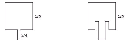 有許多方法可以達(dá)到饋線與阻抗匹配。補(bǔ)片可與一個(gè)四分之一波長(zhǎng)的高阻抗線匹配,或一條50奧姆線可延伸到補(bǔ)片的內(nèi)部,如下圖所示。阻抗在中心點(diǎn)是小的,且阻抗值是跟著軸長(zhǎng)的增加而增加,所以尺寸的選擇是以能得到支持50奧姆的點(diǎn)來決定的。