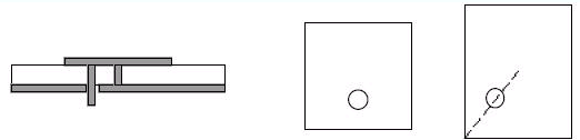 另一種饋線匹配法是將一同軸線的中心導(dǎo)體透過介電質(zhì),在適當(dāng)?shù)淖杩裹c(diǎn)接觸到補(bǔ)片的底部。補(bǔ)片的中心是經(jīng)過此結(jié)構(gòu)中的一個(gè)過孔(via)接地的,如下方的左圖與中圖所示。