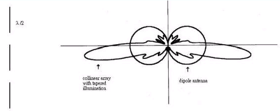 共線性雙極數(shù)組(collinear dipole array)廣泛地應(yīng)用在單點(diǎn)對(duì)多點(diǎn)通訊上,雙極的數(shù)組沿著垂直軸排列,提供集中于水平軸的場(chǎng)型,同時(shí)覆蓋360°的區(qū)域時(shí)。下圖表示半波雙極數(shù)組在不同相角饋給,所產(chǎn)生的輻射場(chǎng)型。
