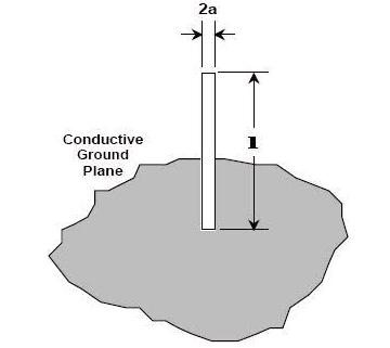 雙極的一半,一個(gè)四分之一波長(zhǎng)單極天線具有輻射電阻R = 36奧姆,可在「半無限導(dǎo)電接地面(semi-infinite conducting ground plane)」上運(yùn)作,如下圖所示。