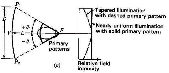 上圖顯示了在設(shè)計(jì)拋物面天線時(shí),所需面對(duì)的取舍問題:弧面對(duì)應(yīng)的夾角和饋線的指向性。如果給定一個(gè)直徑與焦距長(zhǎng)度,對(duì)弧面直徑D所對(duì)應(yīng)的夾角而言,此饋線場(chǎng)型太寬了,將造成能量大量溢出,導(dǎo)致增益減少且天線溫度增高。反之,如果所對(duì)應(yīng)的夾角大于饋線的「半功率波束寬度(Half Power Beam Width;HPBW)」,將會(huì)導(dǎo)致照射度不一致,且在邊緣部位會(huì)逐漸減弱,并伴隨著輻射效益與增益的損失。