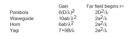下面列出了各式天線的近似指向性(增益)和遠(yuǎn)場(chǎng)邊界以供參考: