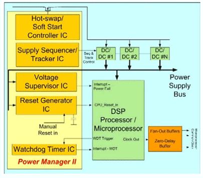 在本文中,電源管理被簡單定義為:對PCB上的全部電源實(shí)施管理(包括:DC-DC轉(zhuǎn)換器、LDO等)。電源管理包括如下功能:管理PCB上DC-DC控制器。例如,熱插拔、軟啟動(dòng)、排序、追蹤、容限和規(guī)整;生成全部相關(guān)的電源狀態(tài)和控制邏輯信號。例如,復(fù)位信號生成、電源故障指示(監(jiān)控)和電壓管理。圖1演示了一個(gè)采用CPU或微處理器的PCB上的典型電源管理功能;熱插拔/軟啟動(dòng)控制功能用于限制浪涌電流以減小電源的啟動(dòng)負(fù)載。對插入有源(live)基板的PCB來說,這是個(gè)重要功能;電源排序和跟蹤功能用于在滿足PCB上的全部器件對上電順序要求的前提下,控制如何開/關(guān)多個(gè)電源。對所有電壓進(jìn)行故障(過/欠壓)監(jiān)測以向處理器就即將發(fā)生的電源故障進(jìn)行預(yù)警。該功能也被稱為“監(jiān)管功能”。