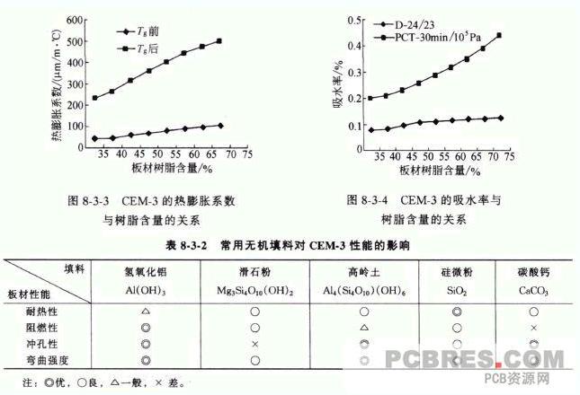 (3)無機填料無機填料是CEM-3 的重要組分之一,作為填充劑,它直接影響板材的尺寸穩定性、通孔可靠性、耐潮濕性和機械加工性等。初的CEM-3 不含有無機填料,玻纖紙的含膠量大,使到板材有機物(環氧樹脂固化物)含量高達60% ,導致板材熱膨脹數和吸水率偏大,然而早期CEM-3 主要用于單面印制線路板,不需考慮通孔可靠性,耐潮濕性即使差一點,問題也不大;隨著CEM-3 應用范圍的擴大,特別是在雙面印制線路板上的應用,這些問題就暴露出來。后來,通過在芯料用膠液中加入無機填料,大大提高CEM-3的無機物比例,使板材中有機物含量和無機物含量的比例下降為40: 60 (質量份) ,接近FR-4 水平,顯著地降低板材的熱膨脹系數和吸水率,圖8-3-3 、圖8-3-4 顯示了CEM-3 的樹脂含量(即有機物含量,通過無機填料用量來調整)與板材熱膨脹系數、吸水率的關系。CEM-3 常用的元機填料有氫氧化鋁、滑石粉、碳酸鈣、硅微粉、高嶺土等,它們對CEM-3 性能的影響見表8-3-2 。目前CEM-3 大量使用的無機填料是氫氧化鋁,氫氧化鋁含有3 個結晶水,在200 - 500 C條件下,不同程度釋放出水,在釋放水時,需吸收大量的熱量,所以氫氧化鋁也是一種理想的"潔凈"阻燃劑,氫氧化鋁的粒徑越小,阻燃效果越好;但是,氫氧化鋁會影響板材的耐熱性、耐浸焊性, PCB 加工熱風整平、元件焊接的溫度都接近氫氧化鋁的分解溫度,如果時間較長,高溫下氫氧化鋁受熱分解,板材會分層起泡;近年有廠家研究對氫氧化鋁進行熱處理,脫去部分在200 多度開始分解的結晶水,可大大提高氫氧化鋁的熱分解溫度,這種含有1. 8-2.9 個結晶水的氫氧化鋁已開始供應市場。