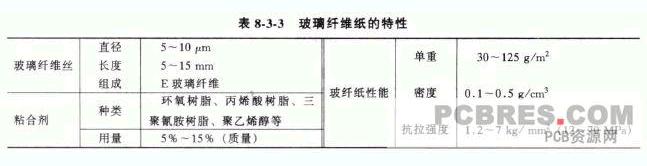 (5) 增強材料CEM-3 采用電子級玻璃纖維布和電子級玻璃纖維紙兩種增強材料。面料的增強材料一般用7628 玻璃纖維布,對一些特殊用途的CEM-3 也采用2116 玻纖布,但會增加產品成本。玻纖布和玻纖紙必須經過硅烷偶聯劑表面處理,以提高耐潮濕性、耐熱性、電氣絕緣性。玻纖紙的強度較低和內應力很小,其對板材翹曲影響較小,而玻纖布存在編織張力及內應力殘留、經緯紗偏斜等不穩定因素,對CEM-3 翹曲影響較大,因此,必須注意玻纖布的經、緯紗的編織密度、緯斜等,同時,生產CEM-3 時須注意面料要同機同布。芯料的增強材料采用玻璃纖維紙(簡稱玻纖紙,又稱玻璃纖維無紡布、玻璃纖維氈、玻璃紙等) ,它由短切玻纖、粘合劑,用濕式短網抄紙機按抄紙方法制成,其特性見表8-3-3 。CEM-3 用玻纖紙一般以綜合性能好的環氧樹脂或丙烯酸樹脂為粘合劑;用聚乙烯醇作粘合劑的玻纖紙,雖然價格便宜,但是耐熱性、耐水性差,已被淘汰出CEM-3 用玻纖紙之列。