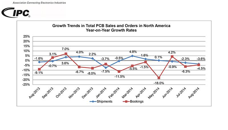2014年8月份,北美PCB行業(yè)總出貨量,同比下降3.6%,把年初至今的出貨量增長率推低到-0.9%。與上月相比,PCB總出貨量環(huán)比上升了4.9個百分點。