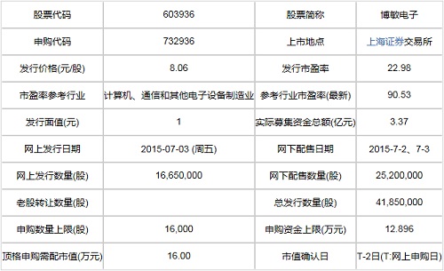 博敏電子此次發行總數為4185萬股,網上發行1665萬股,發行市盈率22.98倍,申購代碼:732936,申購價格:8.06元,單一帳戶申購上限16000股,申購數量1000股整數倍。