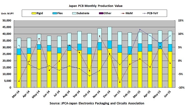 日本2015年6月PCB總產值: 44,152 百萬日元 (Total)