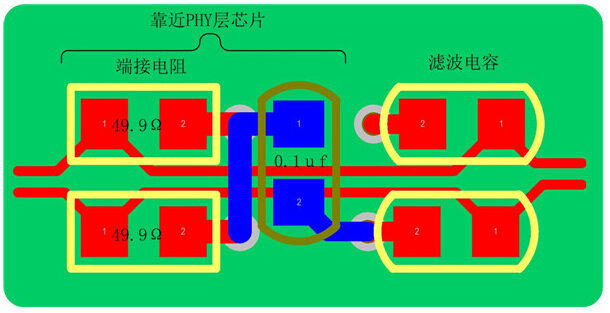 c) 差分信號(hào)終端電阻(49.9Ω,有的PHY層芯片可能沒有)必須靠近PHY層芯片的Rx±、Tx±管腳放置,這樣能更好的消除通信電纜中的信號(hào)反射;