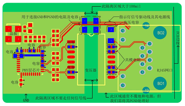 e) 變壓器的兩邊需要割地:即RJ45連接座和變壓器的次級(jí)線圈用單獨(dú)的隔離地,隔離區(qū)域100mil以上,且在這個(gè)隔離區(qū)域下沒有電源和地層存在。這樣做分割處理,就是為了達(dá)到初、次級(jí)的隔離,控制源端的干擾通過參考平面耦合到次級(jí);
