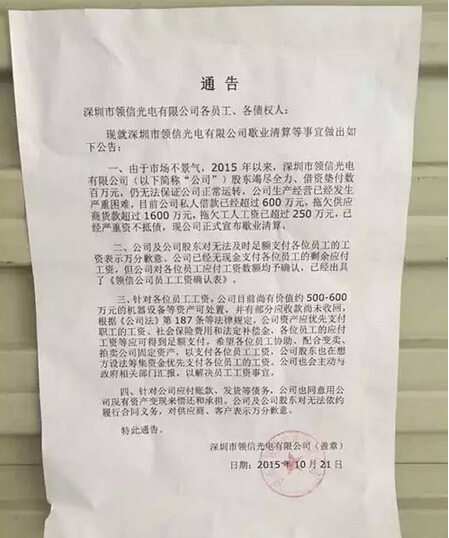 據(jù)領(lǐng)信光電貼出來(lái)的歇業(yè)清算通告顯示,拖欠供應(yīng)商款項(xiàng)逾1600萬(wàn)元,同時(shí)公司負(fù)責(zé)人還私人借款逾600萬(wàn),拖欠員工工資也達(dá)250多萬(wàn)元。