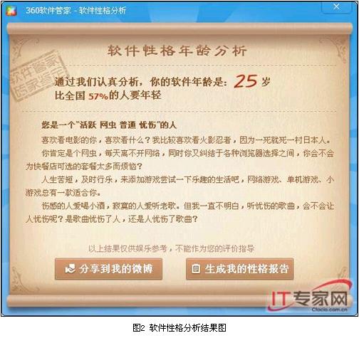 小編還發現,360軟件性格分析還能分析出我們的軟件年齡,如小編只有25歲(竊喜),說明人老心不老哦。可這軟件年齡是怎么得出來的呢?小編猜測是根據安裝軟件的歷史,比如電腦中安裝了WinZip等這類老古董的軟件,電腦會更給你加幾歲;如果像小編360都時刻更新新的豆瓣電臺,那年齡理應比較年輕了。