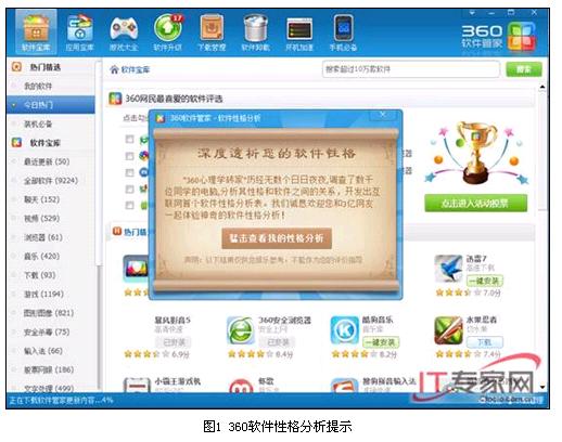 這結果給力準確嗎?神不神馬,小編馬上一試便知。安裝360安全衛士8.5beta版后,一次運行360安全衛士,進入“軟件管家”,“360心理學磚家”會立刻彈出一個“軟件性格分析”提示(如圖1)。